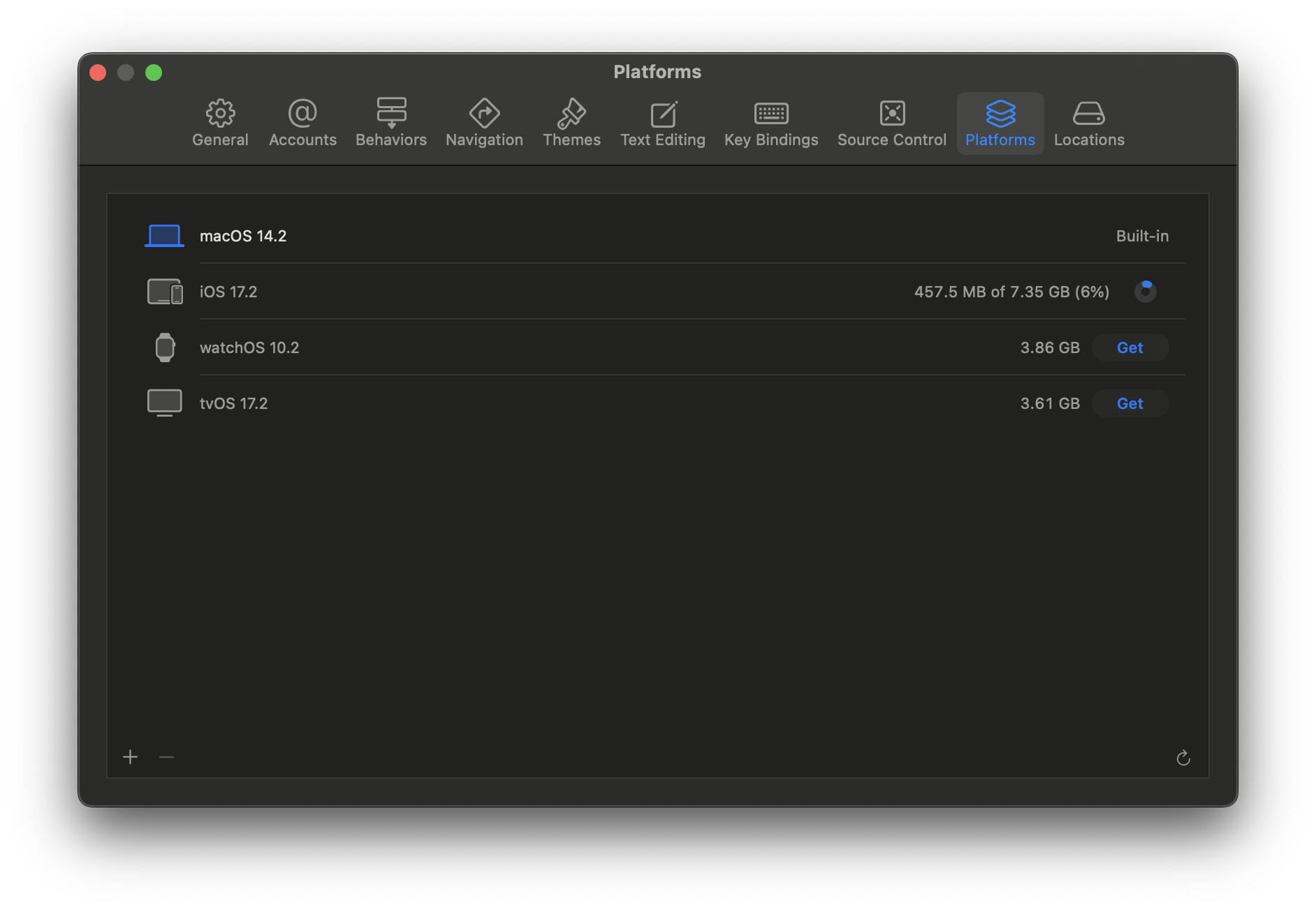 Xcode, select Xcode > Settings > Platforms, and click the GET button for the