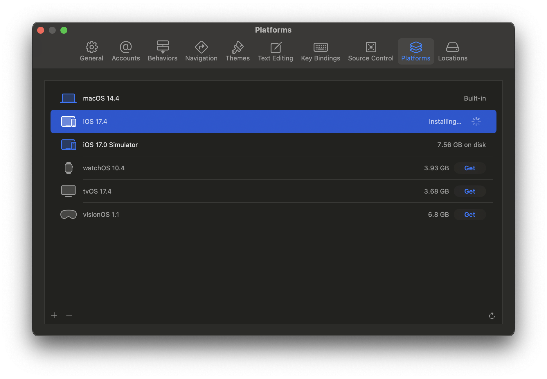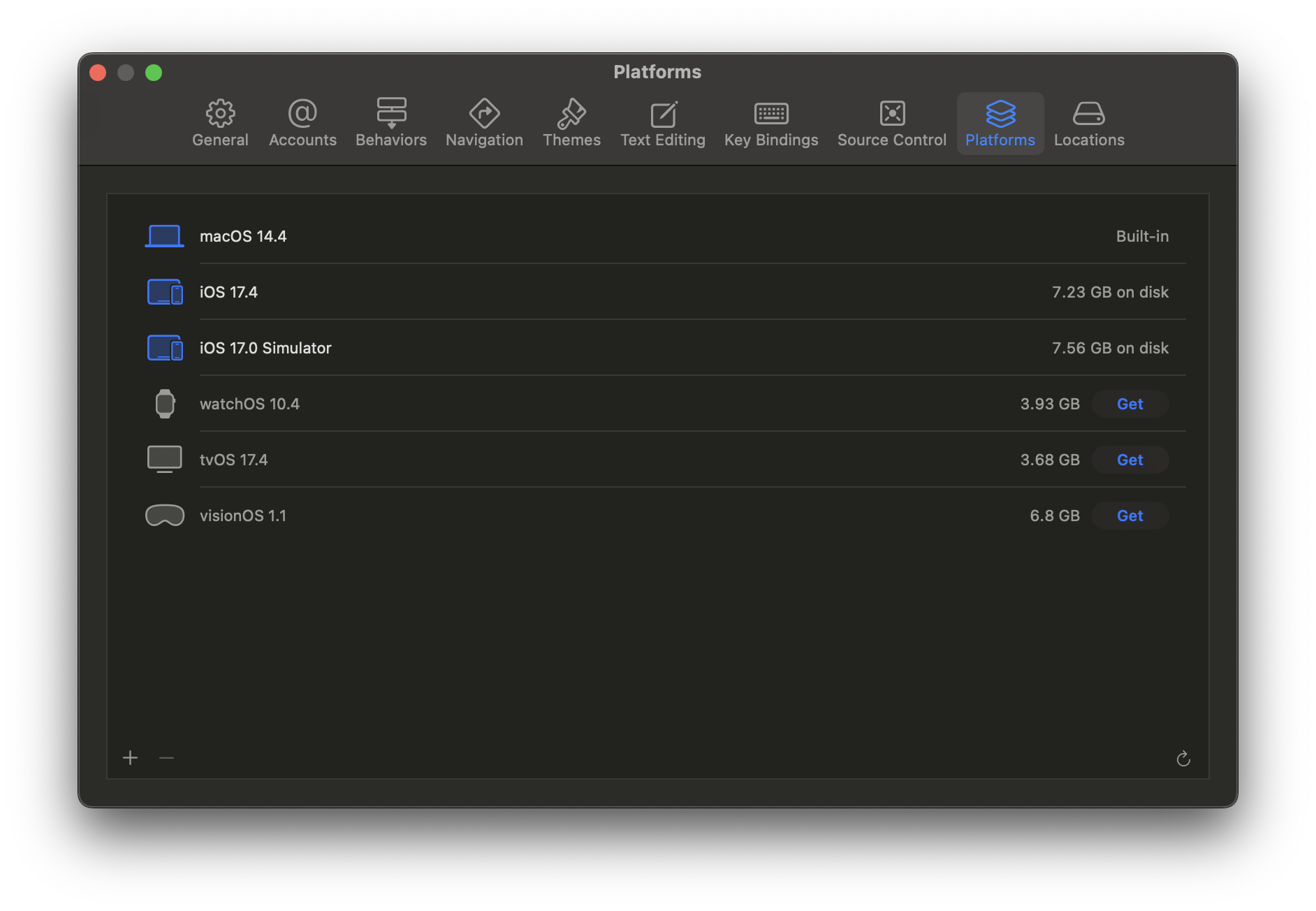 Xcode, select Xcode > Settings > Platforms, and click the GET button for the
