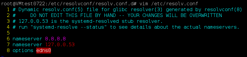 - /etc/resolv.conf 의 기존에 수동으로 추가한 `nameserver 8.8.8.8` 삭제