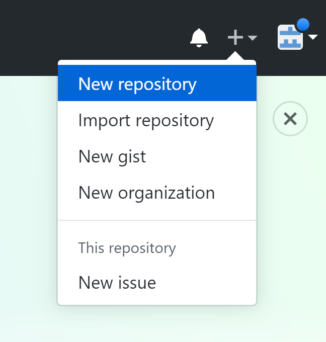Git에 로그인 후 우측 상단의 +버튼 클릭 후 New repository를 클릭해 새로운 레퍼지토리를 생성합니다.