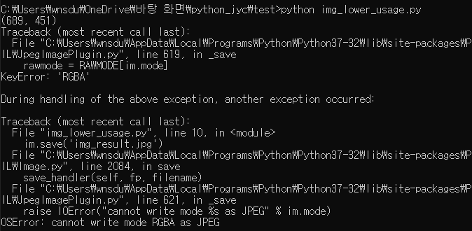File "C:\Users\wnsdu\AppData\Local\Programs\Python\Python37-32\lib\site-packages\PIL\JpegImagePlugin.py", line 621, in _save raise IOError("cannot write mode %s as JPEG" % im.mode) OSError: cannot write mode RGBA as JPEG
