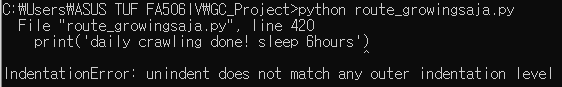 indentation, 즉 들여쓰기한 부분이 맞지 않는다는 에러 로그입니다.