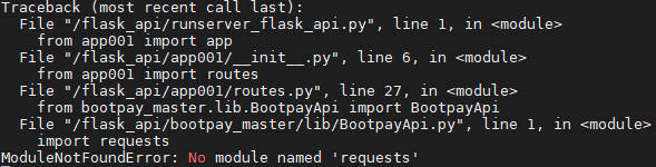 requests 모듈이 없는데, 가동하고자 한 API 프로그램에서 해당 모듈을 불러오는 시도를 했기 때문에 발생했습니다.