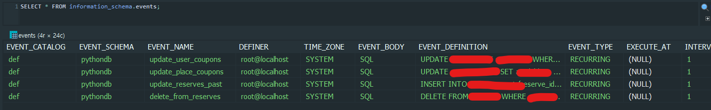 6. 현재 event_scheduler에 등록된 events 내용 확인
